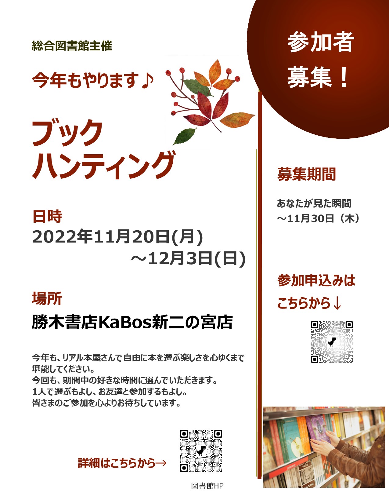 すっかり秋ですね。秋といえば、恒例となりました!?ブックハンティング、今年も開催します。