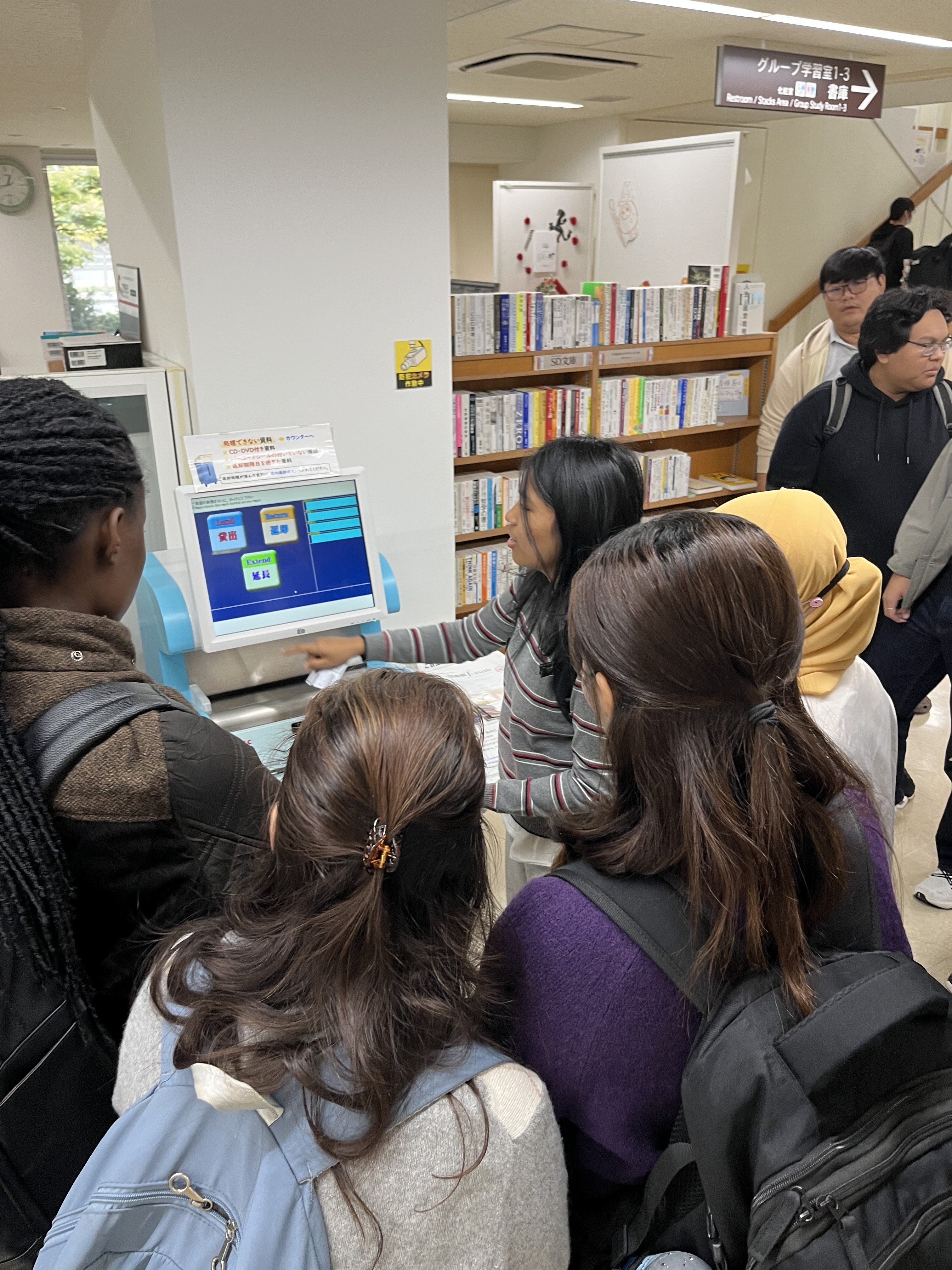 ツアーは、ラーニングアドバイザーのエインさん(学部1年・ミャンマー出身)による英語の館内案内です。毎回12時30分から20分間、ラウンジや閲覧室、LDCなど館内を順に説明します。便利な図書館サービスを案内したり、自動貸出返却装置の使い方を実演形式で紹介したりしました。