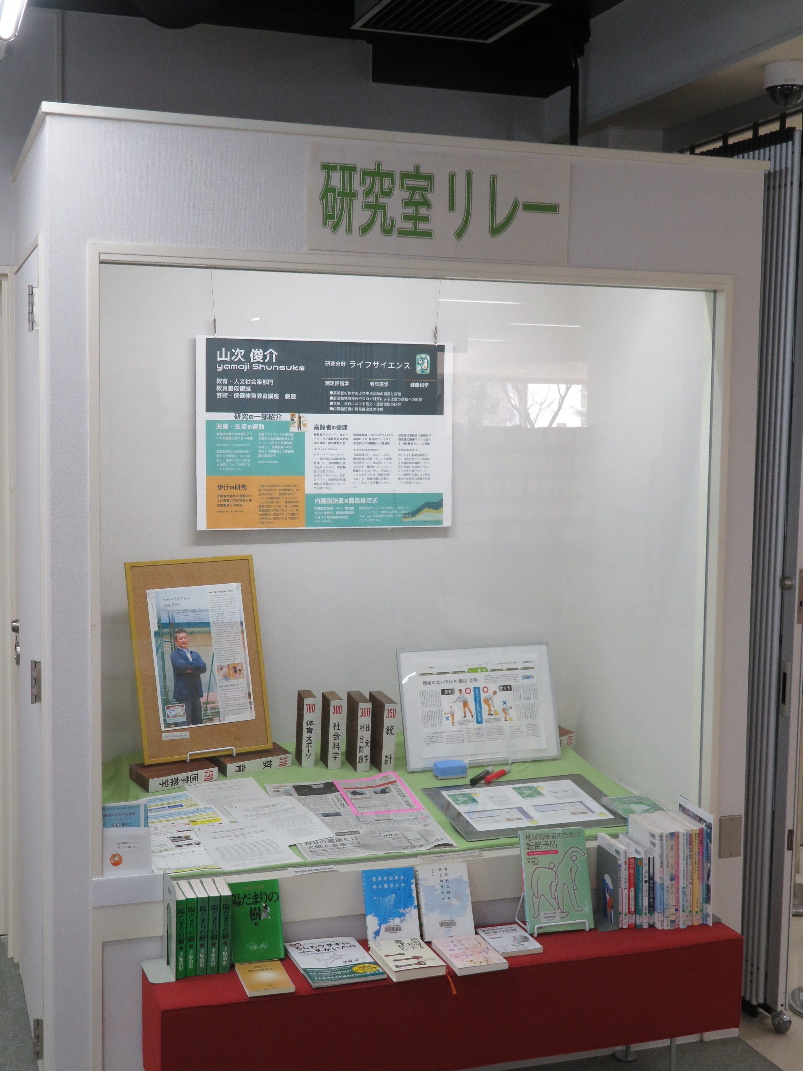 【文京C 研究室紹介】教育学部 山次研究室にバトンタッチ! 総合図書館 イベント 総合図書館では、文京キャンパスの研究室を紹介しています。 場所:総合図書館1階 入って右手奥のメディアコモンズ 今回ご紹介する研究室は、教育学部の 山次 俊介先生 です。 講義:スポーツ健康科学、体育実習、衛生学及び公衆衛生学 研究分野:ライフサイエンス、測定評価学、老年医学、健康科学 研究テーマの論文、研究に関する図書館所蔵の図書を展示しています。 図書館においでの際は、コモンズにぜひお立ち寄りください。