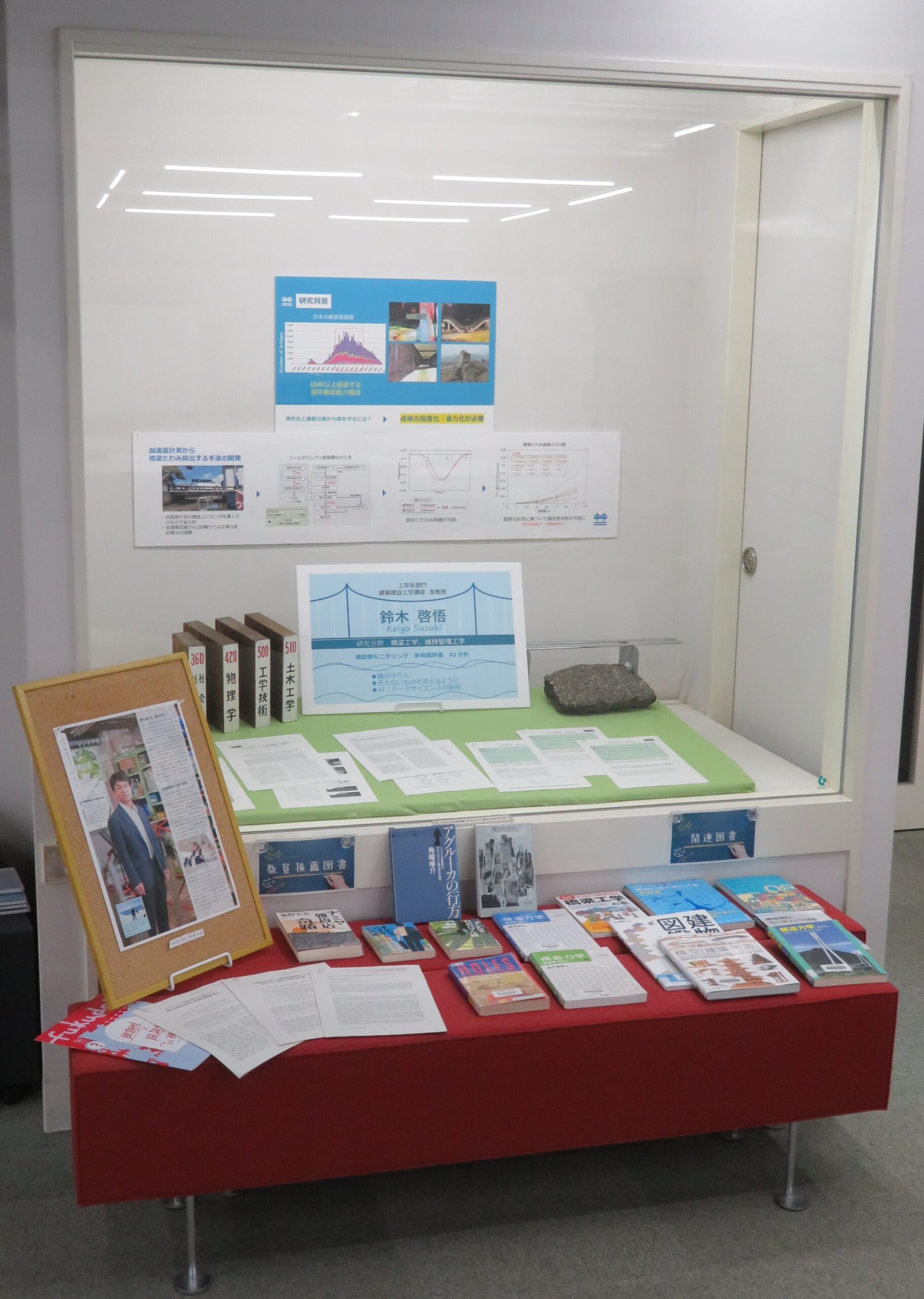 研究テーマの論文、研究に関する図書館所蔵の図書を展示しています。