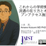 北陸先端科学技術大学院大学の小泉副学長を講師に迎え、「これからの学術情報流通の在り方とオープンアクセス施策」と題した講演が行われました。続いて、福井大学附属図書館から本学におけるオープンアクセス推進の取組事例を紹介した後、参加者によるグループディスカッションを実施しました。「OA(オープンアクセス)についてOAが必要だと思っていない研究者も多い」「学内啓発活動には限界があり、トップダウンでの推進も必要ではないか」など、活発な意見交換が行われました。